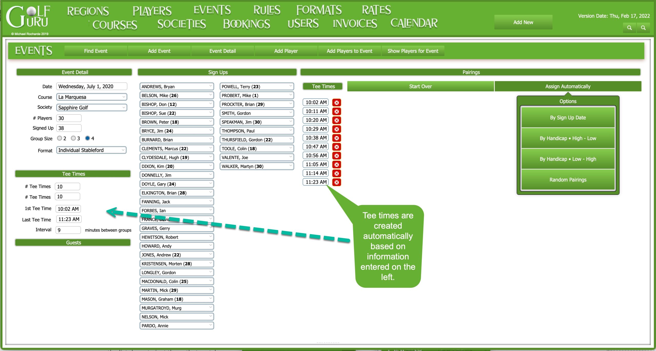 For a society event, or a large group, the program automatically creates the required # of tee times, and keeps track of everybody who has registered, along with their handicaps. When the time comes, the program automatically creates pairings based on the selection made.